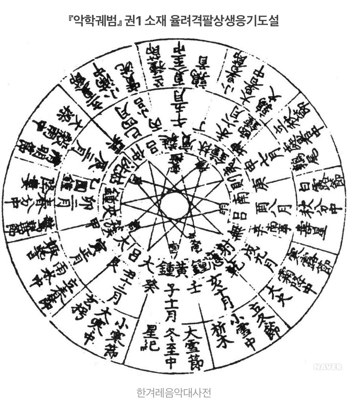 This diagram originates from "Akhak Gwebeom," a book published during the reign of King Seongjong in the 15th century of the Joseon Dynasty. It not only depicts the 12 yul-ryeo (12-tone scale) and the five notes (gung-sang-gak-chi-wu) but also aligns with the 24 seasonal divisions, which include the summer and winter solstices, and the equinoxes, as well as Eastern astrological symbols. This illustration underscores the connection between the macrocosm of the world and the microcosm of musical phenomena, suggesting that the universal 'rhythm' influences and provides a structure for these musical expressions to mirror cosmic patterns.